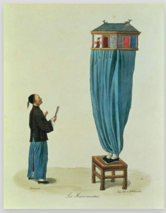Son numerosos los grabados antiguos donde se ven a los titiriteros ambulantes chinos con sus retablos armados sobre el propio cuerpo. También hay imágenes de skoromoj (artistas ambulantes) de Rusia y Eslovenia con teatros similares. Esta forma de trabajo fue tradicional además en Persia y toda Asia Central.